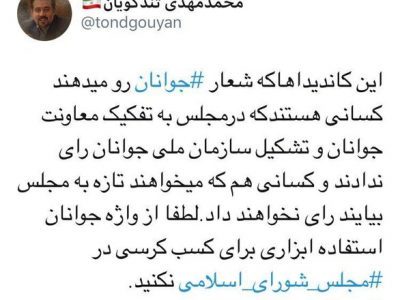 «این کاندیداها که شعار جوانان را میدهند کسانی هستند که درمجلس به تفکیک معاونت جوانان و تشکیل سازمان ملی جوانان رای ندادند و کسانی هم که میخواهند تازه به مجلس بیایند رای نخواهند داد. لطفا از واژه جوانان استفاده ابزاری برای کسب کرسی در مجلس شورای اسلامی نکنید.»