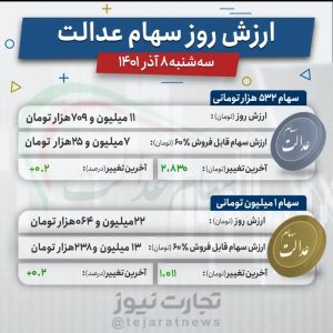 ارزش روز سهام عدالت یک میلیون تومانی هم با رشد بیش از ۱۰۰ هزار تومانی به ۲۲ میلیون و ۰۶۴ هزار تومان رسید.