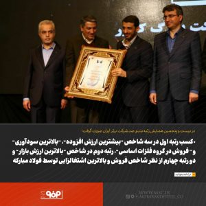 • کسب رتبه اول در سه شاخص “بیشترین ارزش افزوده”، “بالاترین سودآوری” و ” فروش در گروه فلزات اساسی”، رتبه دوم در شاخص “بالاترین ارزش بازار” و دو رتبه چهارم از نظر شاخص فروش و بالاترین اشتغالزایی توسط فولاد مبارکه