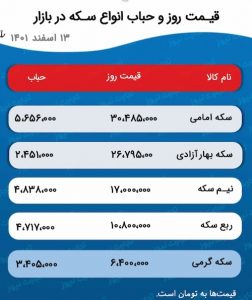 امروز ۱۳ اسفند ۱۴۰۱ قیمت سکه امامی یک میلیون و ۱۰۵ هزار تومان گرانتر از روز پنجشنبه معامله شد. این قطعه از سکه در لحظه نگارش این گزارش به قیمت ۳۰ میلیون و ۴۸۵ هزار تومان رسید و بیشترین افزایش قیمت را در خانواده سکهها داشت. سکه بهار با قیمت ۲۶ میلیون و ۷۹۵ هزار تومان معامله شد و ۳۱۵ هزار تومان افزایش قیمت داشت.