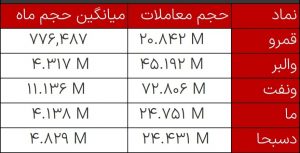 بررسی معاملات بازار امروز نشان میدهد که سهمهای زیر حجم مشکوک داشتند و به طور متوسط هشت تا ۹ برابر میانگین حجم ماه خود حجم خوردند. در جدول زیر M نشانه میلیون است.