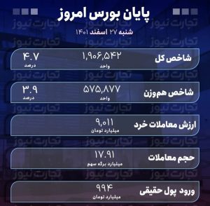 پایان بورس امروز ۲۷ اسفند ۱۴۰۱ / جهش بلند شاخص کل به قله ۱.۹ میلیون واحدی