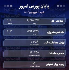 گفتنی است تابلو بورس اوراق بهادار تهران، حجم معاملات امروز را ۱۶ میلیارد و ۴۵۰ میلیون و ارزش معاملات را هفت هزار و ۶۵۵ میلیارد تومان نشان میدهد.