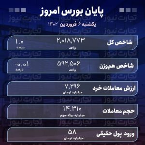 گفتنی است تابلو بورس اوراق بهادار تهران، حجم معاملات امروز را ۱۴ میلیارد و ۳۱۰ میلیون و ارزش معاملات را هفت هزار و ۲۹۶ میلیارد تومان نشان میدهد.