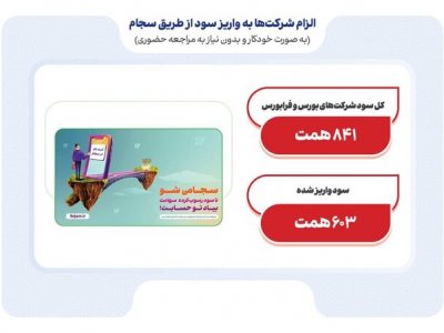 با توسعه زیرساخت‌های بازار سرمایه در سال گذشته و با الزام سازمان بورس به شرکت‌های بورسی و فرابورسی برای واریز سود از طریق سجام به‌طور خودکار و بدون نیاز به مراجعه حضوری، از مجموع ۸۴۱ هزار میلیارد تومان سود شرکت‌های بورسی و فرابورسی در سال مالی ۱۴۰۰، بالغ بر ۶۰۳ همت از مبلغ مذکور که در سال گذشته به عنوان سود نقدی در مجامع تقسیم شده بود، از طریق سجام به حساب سهامداران واریز شد.