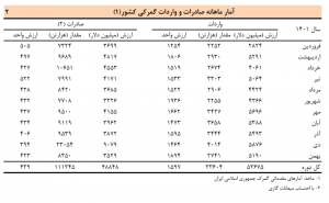 به علاوه ارزش هر تن کالای صادراتی و وارداتی نیز در این دوره به ترتیب، ۱۳.۶ و۲۶.۱ درصد افزایش یافته و در یازده ماهه سال جاری، وزن صادرات و واردات گمرکی به ترتیب، ۱۱۱.۳ و ۳۳.۶ میلیون تن بود که نسبت به دوره مشابه سال قبل به ترتیب، ۲.۱ و ۶.۸ درصد کاهش یافته است.