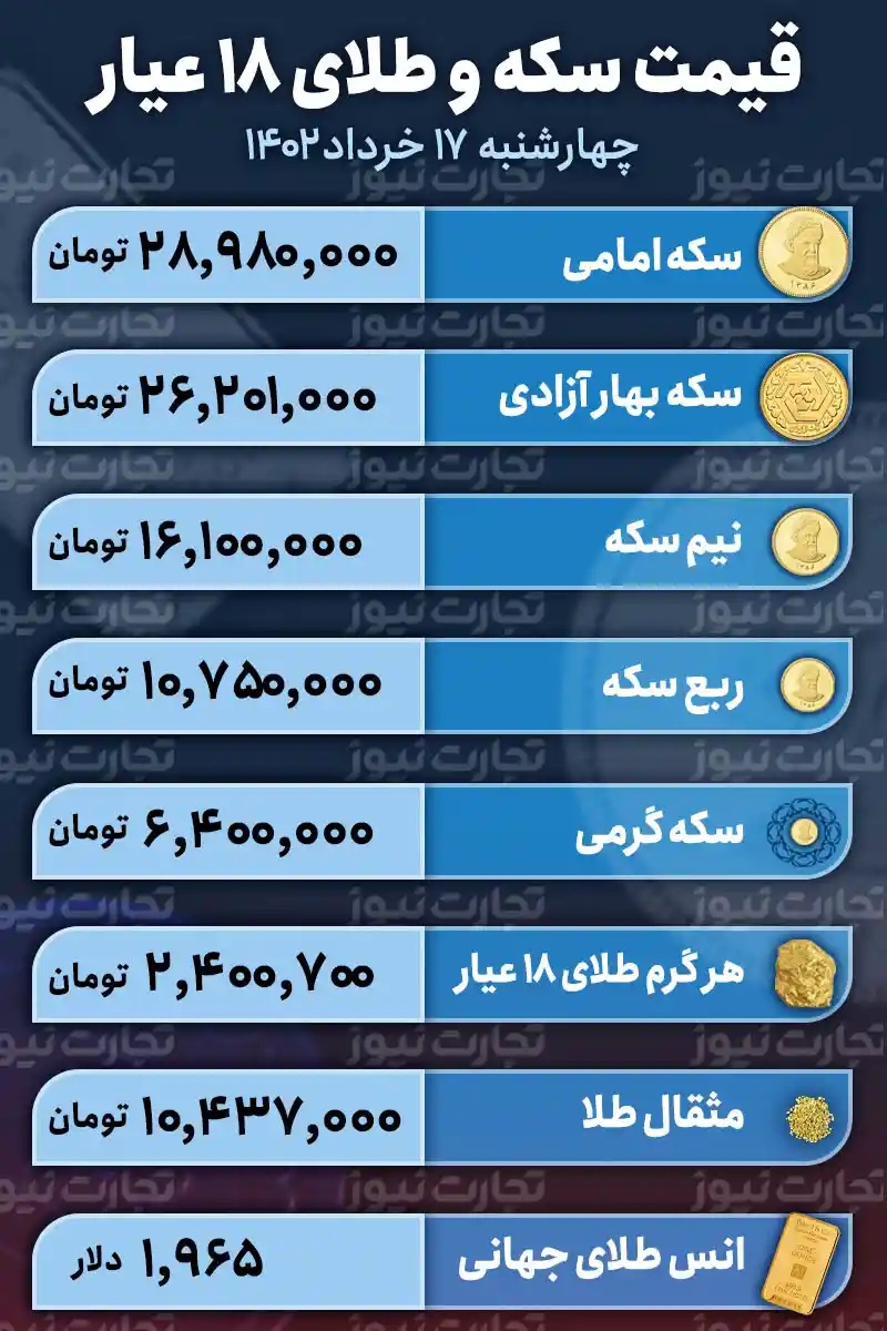 در همین حال قیمت هر سکه بهار آزادی نیز امروز به ۲۶ هزار و ۲۰۱ تومان رسید. هر قطعه نیمسکه هم اکنون با قیمت ۱۶ میلیون و ۱۰۰ هزار تومان معامله میشود. در همین حال قیمت ربع سکه نیز به ۱۰ میلیون و ۷۵۰ میلیون تومان رسیده است.