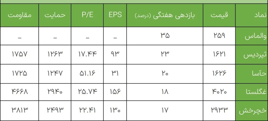 نگاهی به معاملات این هفته بازار حاکی از آن است که والماس با افزایش ۳۵ درصدی، لقب بیشترین بازدهی را سهم خود کرده و به قیمت ۲۵۹ تومان رسیده است.