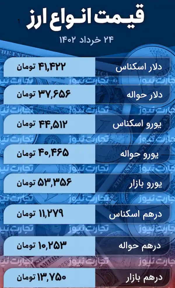 روز گذشته سهشنبه ۲۳ خردادماه قیمت دلار در مرکز مبادله طلا و ارز کاهش داشت. اسکناس دلار در سایت بازار متشکل ارزی با قیمت ۴۱ هزار و ۴۲۲ تومان معامله شد و حدود ۱۰۰ تومان کاهش قیمت داشت. دلار حواله نیز با کاهش ۱۰۰ تومانی با رقم ۳۷ هزار و ۶۵۶ تومان عرضه شد.