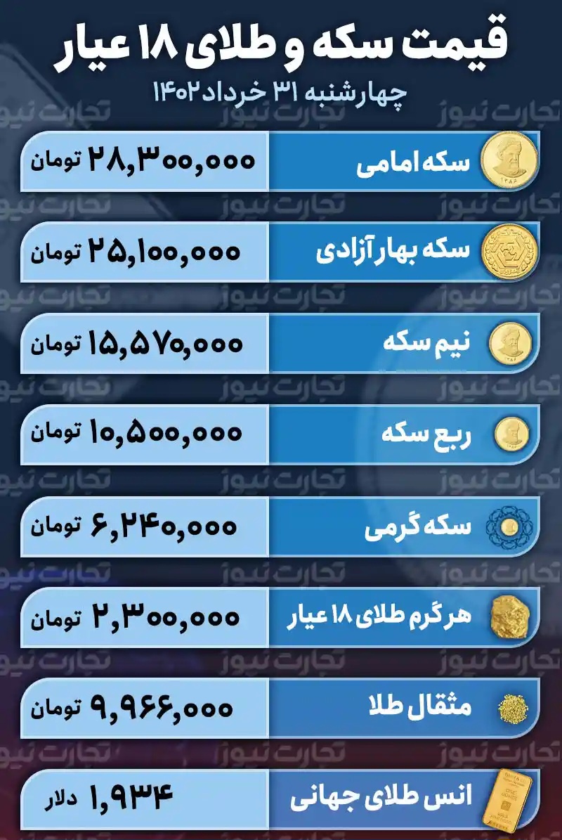 قیمت سکه بهار آزادی با ۲۰۰ هزار تومان کاهش قیمت به ۲۵ میلیون و ۱۰۰ هزار تومان رسید. قیمت نیم سکه با افت ۱۰۰ هزار تومانی به ۱۵ میلیون و ۵۷۰ هزار تومان رسید. ربع سکه هم ۱۰ میلیون و ۵۰۰ هزار تومان قیمت خورد که ۱۰۰ هزار تومان نسبت به روز گذشته کاهش قیمت داشت. قیمت سکه گرمی هم بدون هیچ تغییری ۶ میلیون و ۲۴۰ هزار تومان شد.