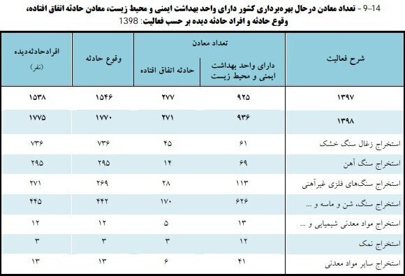 بر اساس گزارش مرکز آمار و اطلاعات راهبردی وزارت کار از مقایسه حوادث معدنی در سالهای ۱۳۹۷ و ۱۳۹۸ بیش از ۹۳۰ معدن در سال ۱۳۹۸ دارای واحد بهداشت و ایمنی و محیط زیست بوده که نسبت به سال قبل از آن افزایش داشته است ولی با وجود استقرار واحد ایمنی و بهداشت در معادن مذکور، تعداد وقوع حادثه و افراد حادثه دیده در معدن نسبت به سال ۱۳۹۷ افزایش داشته است.