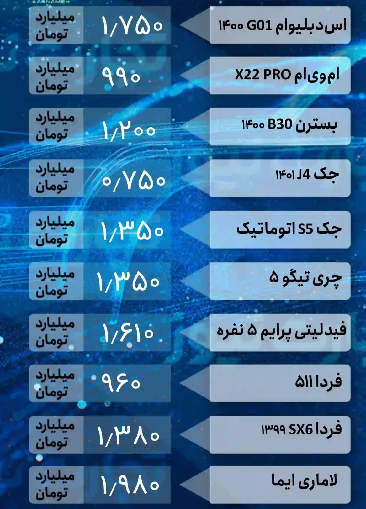 ترمز قیمت خودرو امروز ۲۲ تیر ۱۴۰۲ کشیده شد. اغلب محصولات، پنجشنبه خود را در ثبات کامل به سر بردند و تعداد کمی، افزایش یا کاهش بسیار اندکی تجربه کردند.