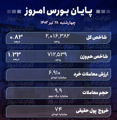 امروز شاخص کل بورس تهران ۱۶ هزار و ۶۶۱ پله بالا رفت و با رشد ۰.۸۳ درصدی در ارتفاع دو میلیون و ۱۶ هزار و ۳۸۲ واحد ایستاد. شاخص هموزن نیز امروز با رشد ۹ هزار و ۳۵۷ واحدی معادل ۱.۳۳ درصد رشد کرد و به سطح ۷۱۲ هزار و ۵۳۹ واحد رسید.