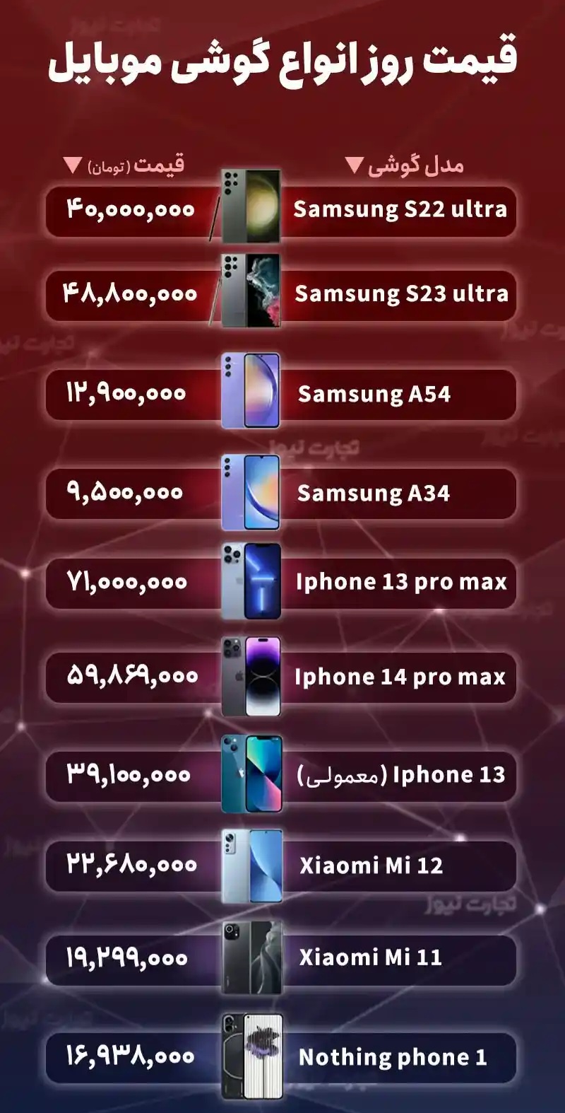 در گروه سامسونگ نیز مدلهای S22 ultra در سطح ۴۰ میلیون تومان، مدل S23 ultra در سطح ۴۸میلیون و ۸۰۰ هزار تومان نسبت به هفته گذشته بدون تغییر ماندند.