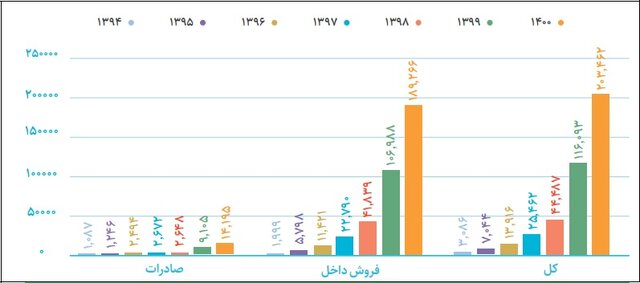 سهم صادرات و فروش داخل در کنار حجم کل بازار فروش محصولات نانو ساخت ایران در نمودار ذیل نمایش داده شده است: