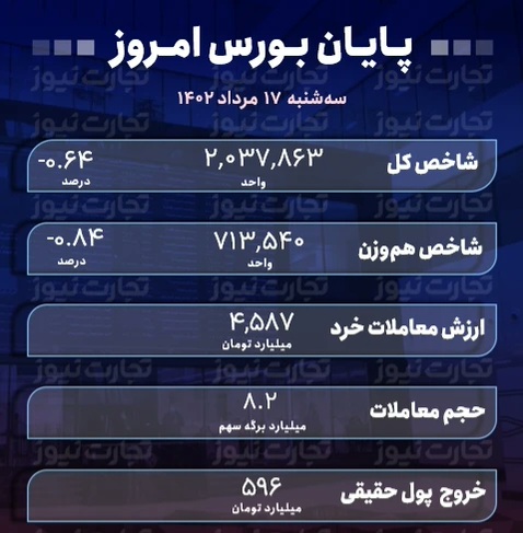 معاملات بورس امروز به گونهای بسته شد که رشد شاخص کل، پس از چند روز متوقف شد. به این ترتیب نماگر اصلی تالار شیشهای با افت ۱۳ هزار و ۲۰۸ واحدی که معادل ۰.۶۴ درصد این شاخص است روبهرو شد. بر این اساس شاخص کل در پایان معاملات امروز در سطح دو میلیون و ۳۷ هزار واحدی ایستاد.