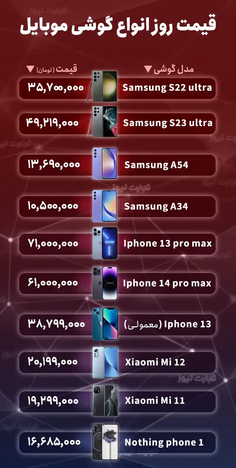 در گروه سامسونگ تغییر چندانی مشاهده نشد و قیمت گوشی S22 ultra در همان سطح روز گذشته، ۳۵ میلیون و ۷۰۰ هزار تومان باقی ماند. قیمت گوشی S23 ultra نیز باز هم کاهش اندکی یافت و به ۴۹ میلیون و ۲۱۹ هزار تومان رسید. سری اقتصادی A54 و A34 همچنان جایگاه قیمتی خود را حفظ نموده و به ترتیب ۱۳ میلیون و ۶۹۰ هزار تومان و ۱۰ میلیون و ۵۰۰ هزار تومان را تثبیت نمودند.