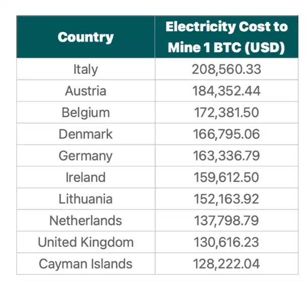 این گزارش، ایتالیا را به عنوان پرهزینهترین کشور برای استخراج بیت کوین خانگی با ۲۰۸۵۶۰ دلار به ازای هر بیت کوین معرفی کرد. در زمان انتشار، این نشان میدهد که هزینه استخراج یک بیت کوین در ایتالیا معادل ارزش تقریباً هشت بیت کوین است.