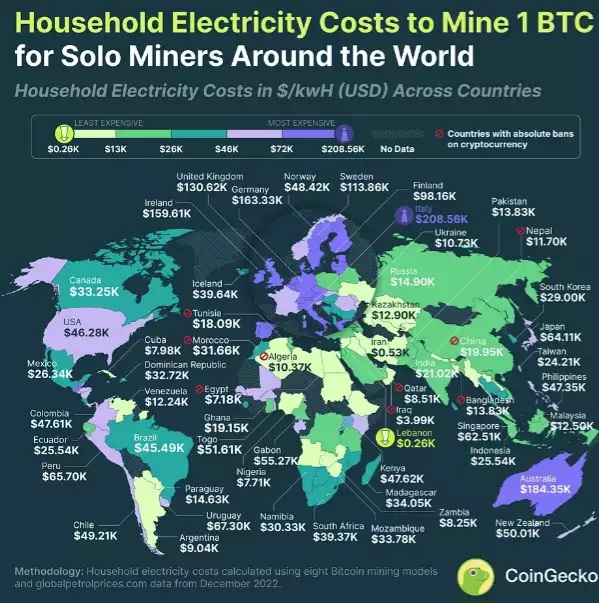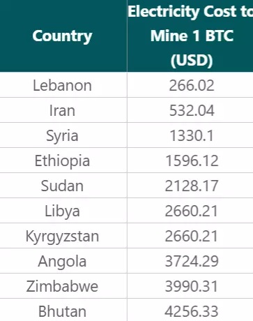 تفاوت قابل توجهی در سراسر جهان در هزینههای برق خانگی برای استخراجکنندگان بیت کوین وجود دارد. طبق این گزارش ارزانترین کشور برای استخراج بیت کوین، لبنان است.
