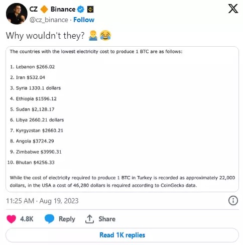 CZ یکی از کاربران X را تصدیق کرد که توضیح داد بسیاری از این کشورها برق کافی برای استفاده بیشتر از هزینههای ارزان برق را ندارند.