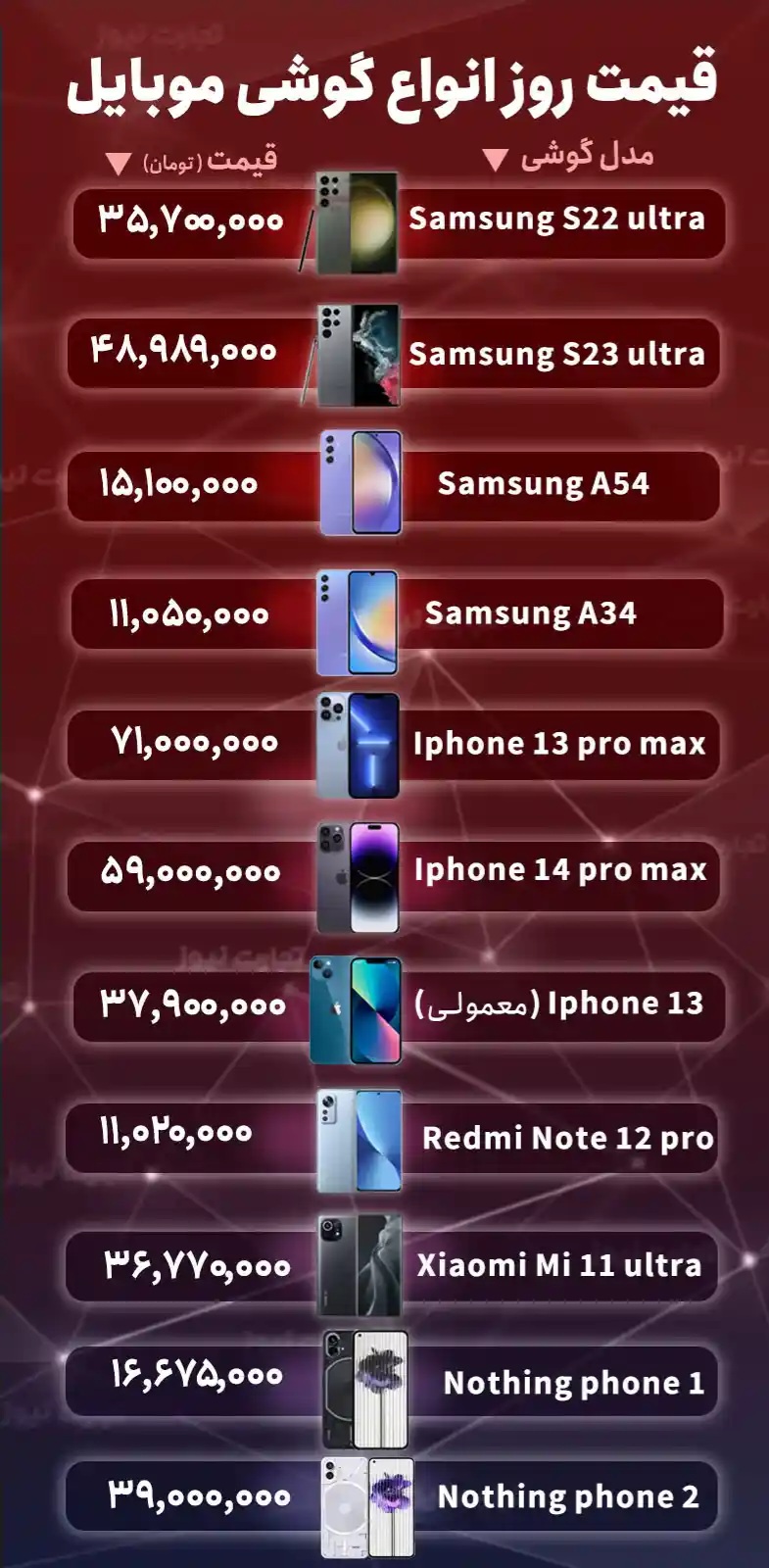 در گروه ناتینگفون، تغییری صورت نگرفت و مدل Nothing phone 1 همچنان در سطح ۱۶ میلیون و ۶۷۵ هزار تومان و مدل Nothing phone 2 در سطح ۳۹ میلیون تومان باقی ماندند.