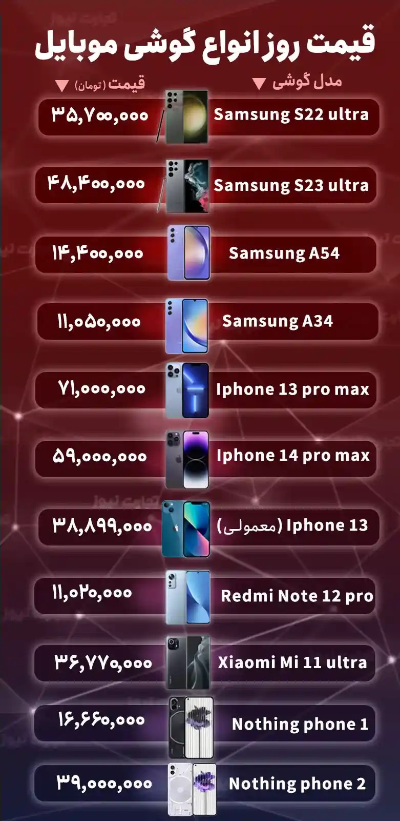 در گروه سامسونگ، نوسانات جزئی در بعضی مدلها رخ داد. قیمت گوشی S22 ultra و سری اقتصادی A34 بدون تغییر و به ترتیب در همان سطح ۳۵ میلیون و ۷۰۰ هزار تومان و ۱۱ میلیون و ۵۰ هزار تومان ثابت ماندند. در این گروه برخی مدلها کاهش قیمت داشتند. بهطوری که قیمت گوشی S23 ultra در سطح ۴۸ میلیون و ۴۰۰ هزار تومان و سری اقتصادی A54 در سطح ۱۴ میلیون و ۴۰۰ هزار تومان قرار گرفتند.