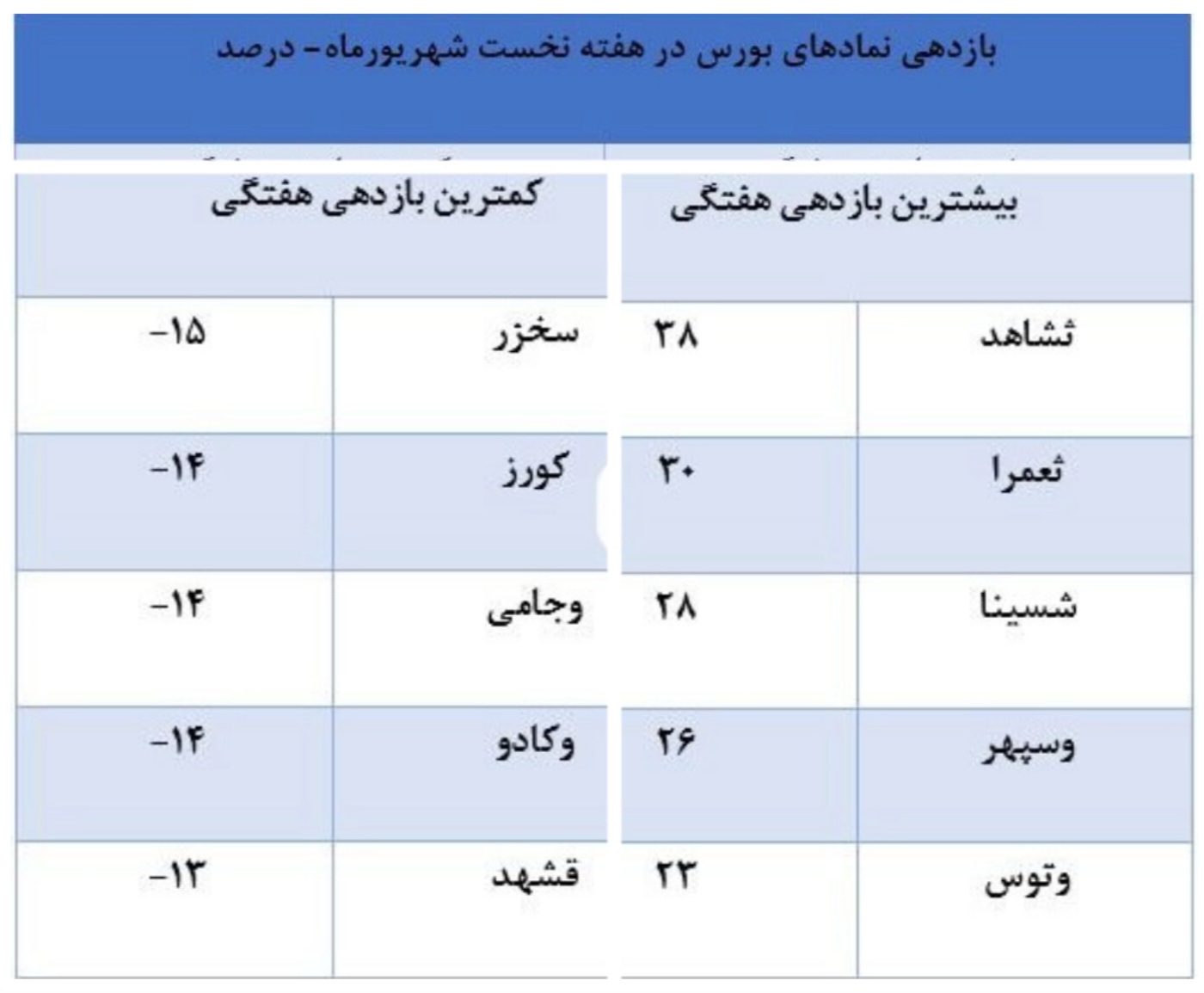 در نخستین هفته معاملاتی شهریور، قیمت بسیاری از سهمها در سایه صعود بازار رشد کرد اما قیمت برخی دیگر از سهام کاهشی بود و بازدهی منفی ثبت کرد.