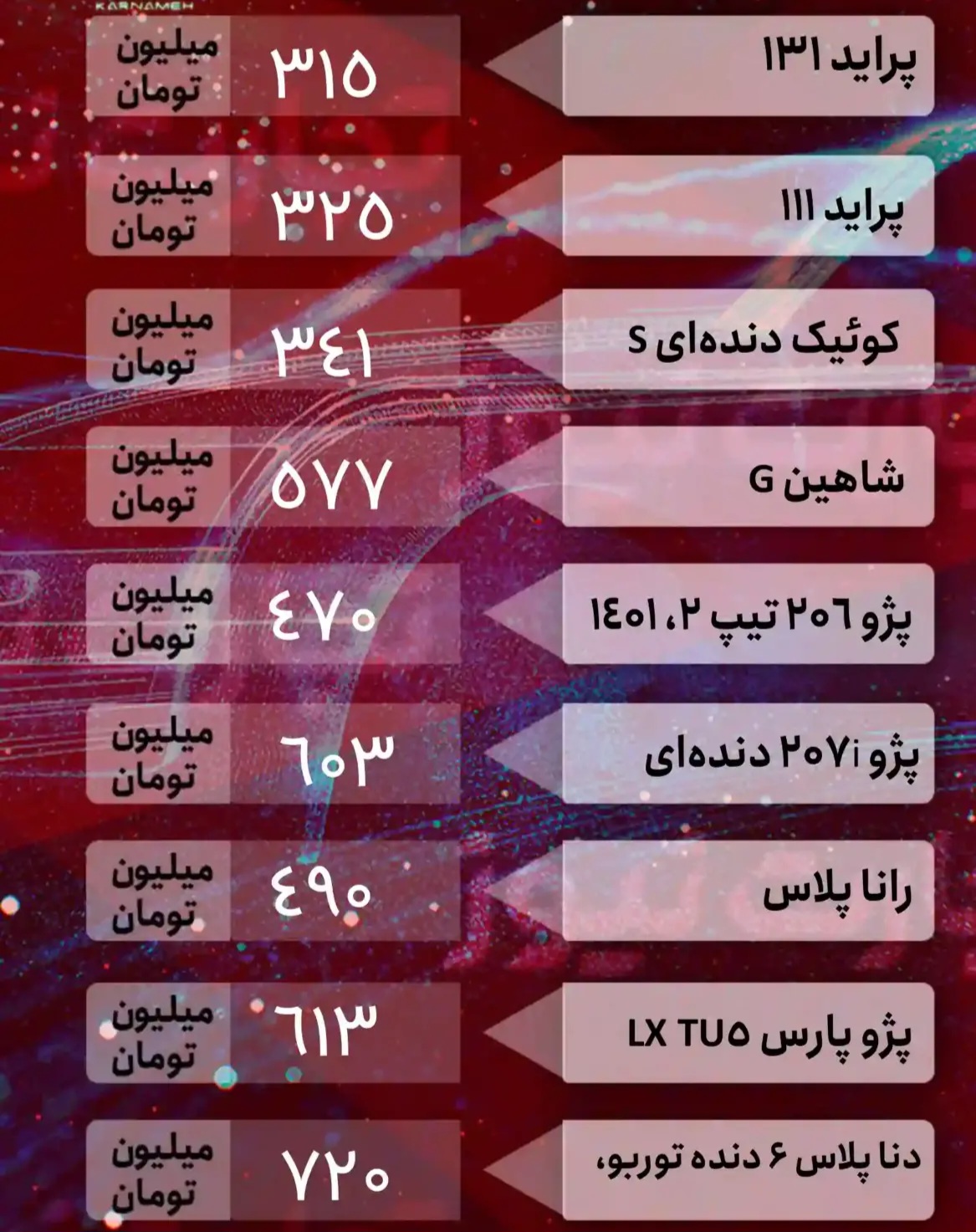 مطابق با قیمتهای اعلامی وبسایت کارنامه، قیمت اکثر خودروهای داخلی و مونتاژی در بازار آزاد امروز افزایشی بود.