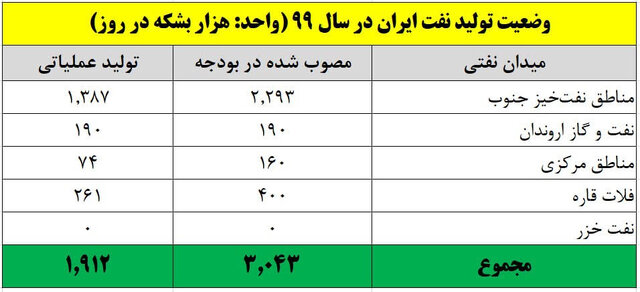 هاشم زاده با بیان اینکه در سال ۱۳۹۹ حدود ۳۰۰ هزار بشکه نفت به فروش رسید و اکنون این عدد یک میلیون و ۸۰۰ هزار بشکه است، اظهار کرد: میزان تولید نفت طبق «بودجه مصوب» و «تولید عملیاتی» را به تفکیک مناطق عملیاتی در سال ۱۳۹۹ نشان میدهد. طبق این جدول با توجه به بودجه شرکت ملی نفت ایران، برنامهریزی برای تولید حدود ۳ میلیون بشکه نفت در روز انجام شده بود که احتمالا به دلیل محدودیتهای «مالی» و «صادرات نفت» ناشی از تحریمها، این هدفگذاری محقق نشده و میزان تولید، عددی کمتر از ۲ میلیون بشکه در روز را ثبت کرده است.